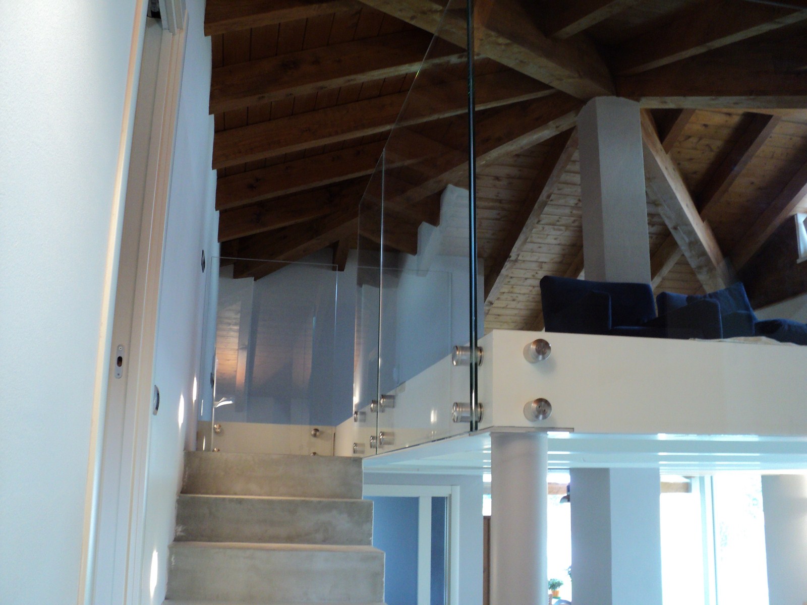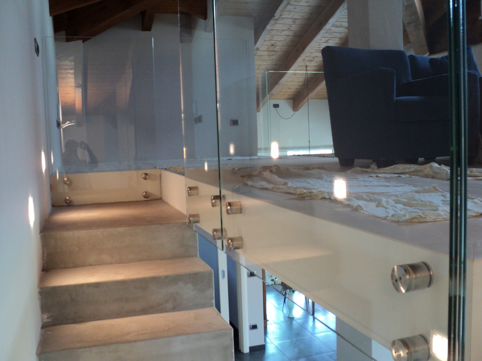 Parapetto in cristallo stratificato temperato trasparente extrachiaro con fissaggio a borchie e morsetti