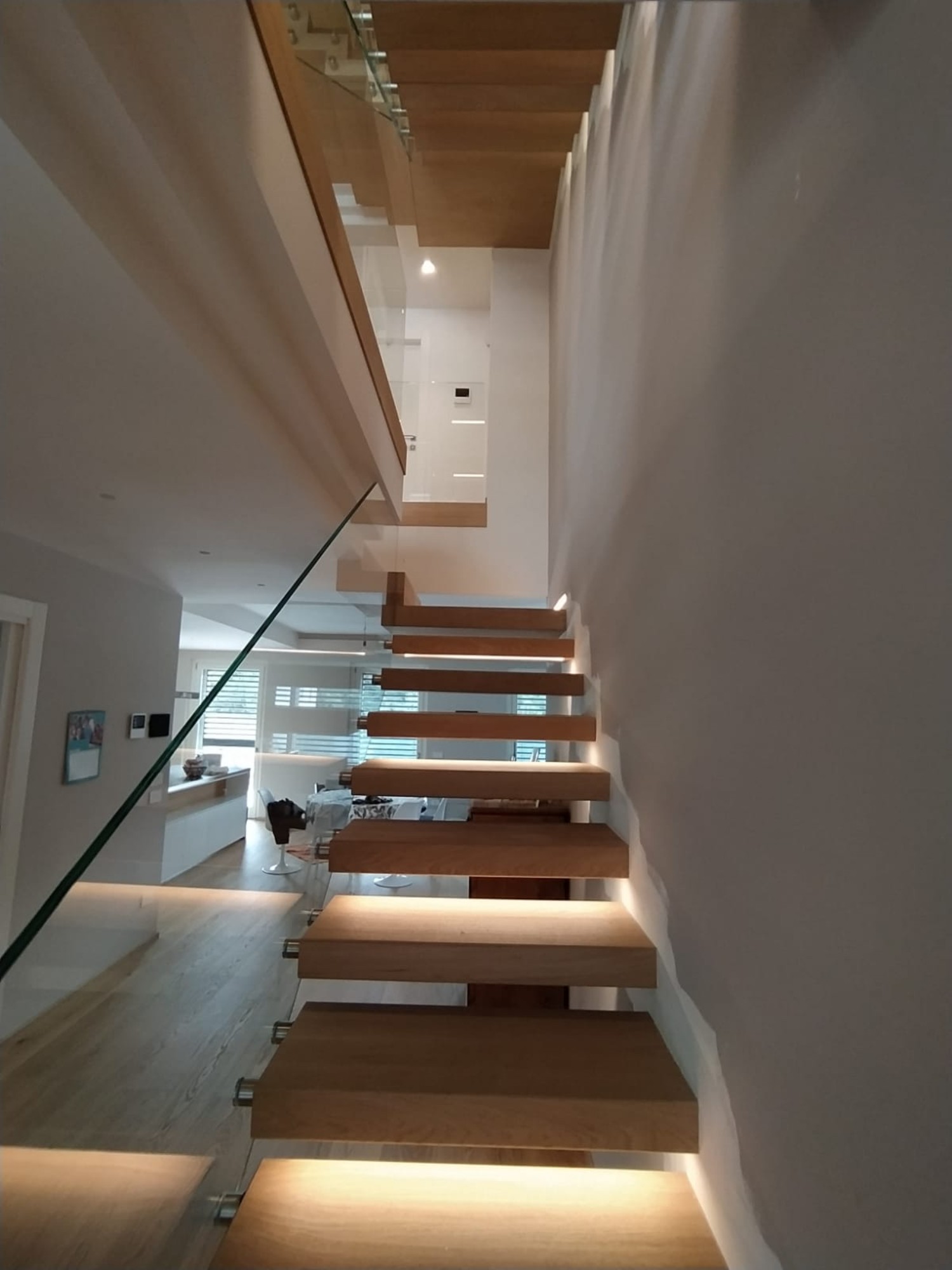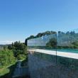 Parapetto in cristallo stratificato 8+8 trasparente, temperato con angoli di sicurezza e fissaggi a borchia in acciaio satinato con raccordo su misura a modulo.