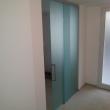 Porta scorrevole a due ante in cristallo mm 10 satinato, temperato, con meccanismo "attacco a soffitto" e parti metalliche in acciaio spazzolato completa di soft-close in apertura e chiusura.