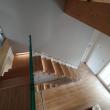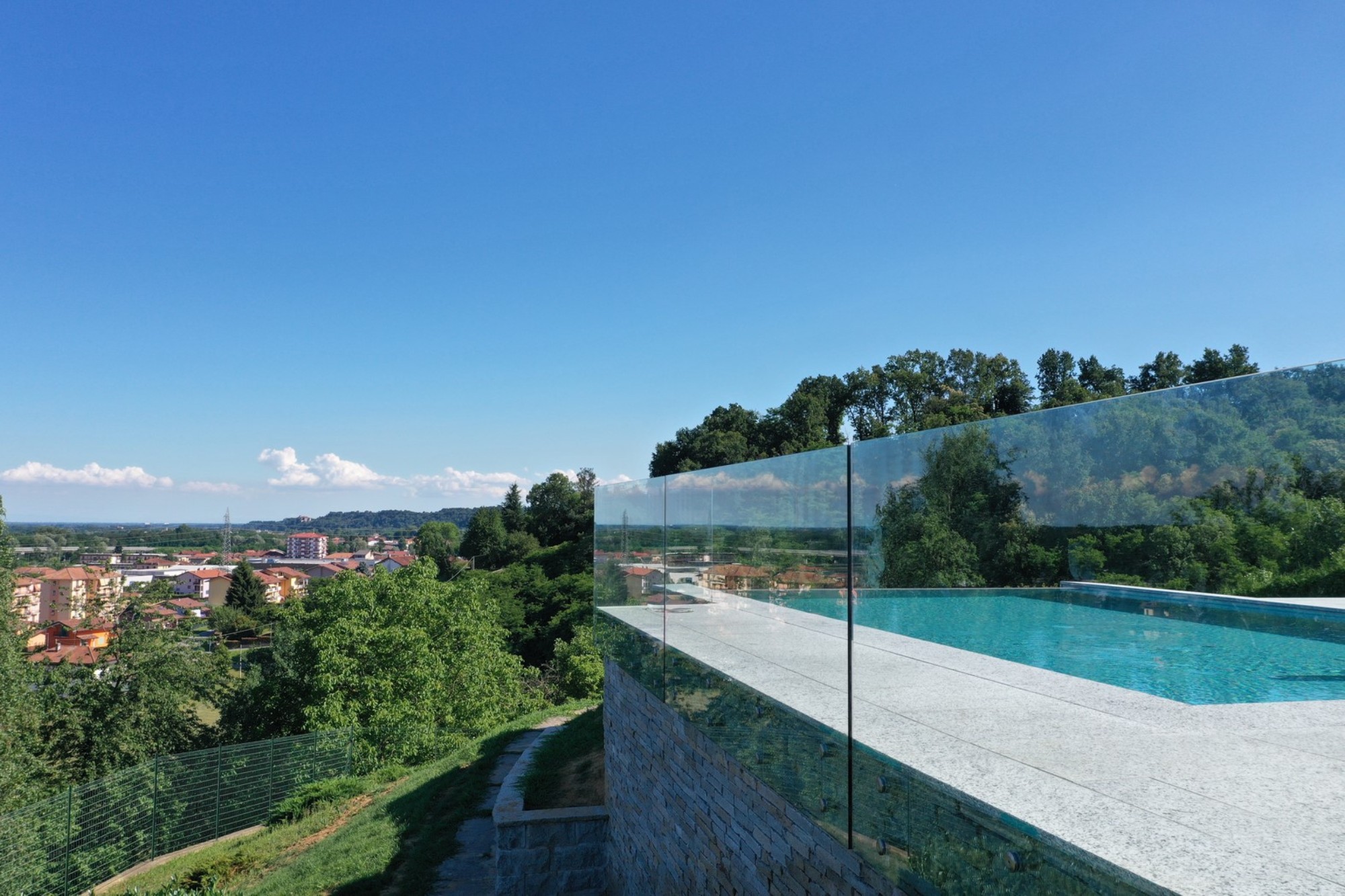 Parapetto in cristallo stratificato 8+8 trasparente, temperato con angoli di sicurezza e fissaggi a borchia in acciaio satinato con raccordo su misura a modulo.